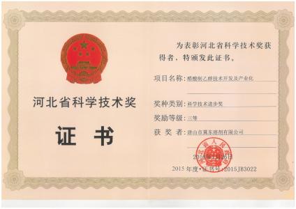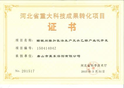 2015年3月,由唐山冀東溶劑有限公司承擔的“醋酸間接加氫法生產無水乙醇產業化開發”項目,被列入河北省重大科技成果轉化專項計劃。醋酸制乙醇項目列入2015年河北省重大科技成果轉化專項計劃醋酸制乙醇項目列入2015年河北省重大科技成果轉化專項計劃醋酸制乙醇項目列入2015年河北省重大科技成果轉化專項計劃醋酸制乙醇項目列入2015年河北省重大科技成果轉化專項計劃